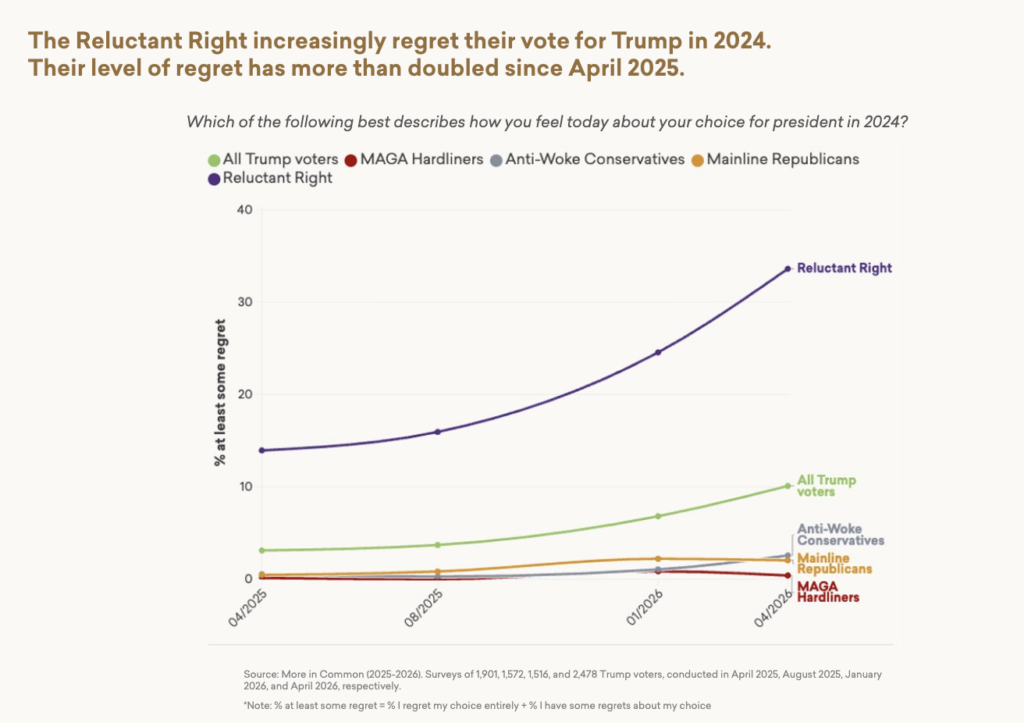 of the Reluctant Right say they have at least some regret about voting for President Trump, up from 13 percent in April 2025.