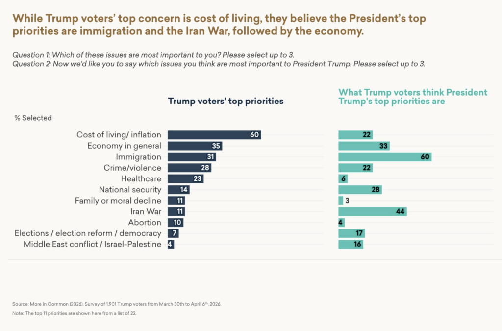 of Trump voters name the cost of living as their top concern. Only 11 percent think the cost of living is a priority for President Trump.