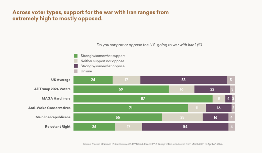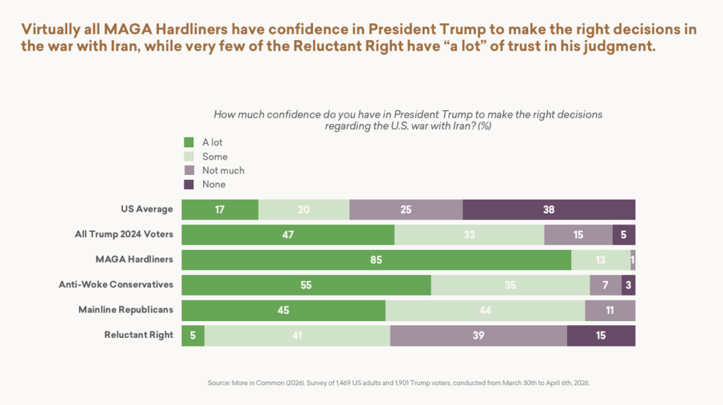 Trump voters are supportive of the war with Iran. 87 percent of MAGA Hardliners support the war while only 26 percent of the Reluctant Right support it.