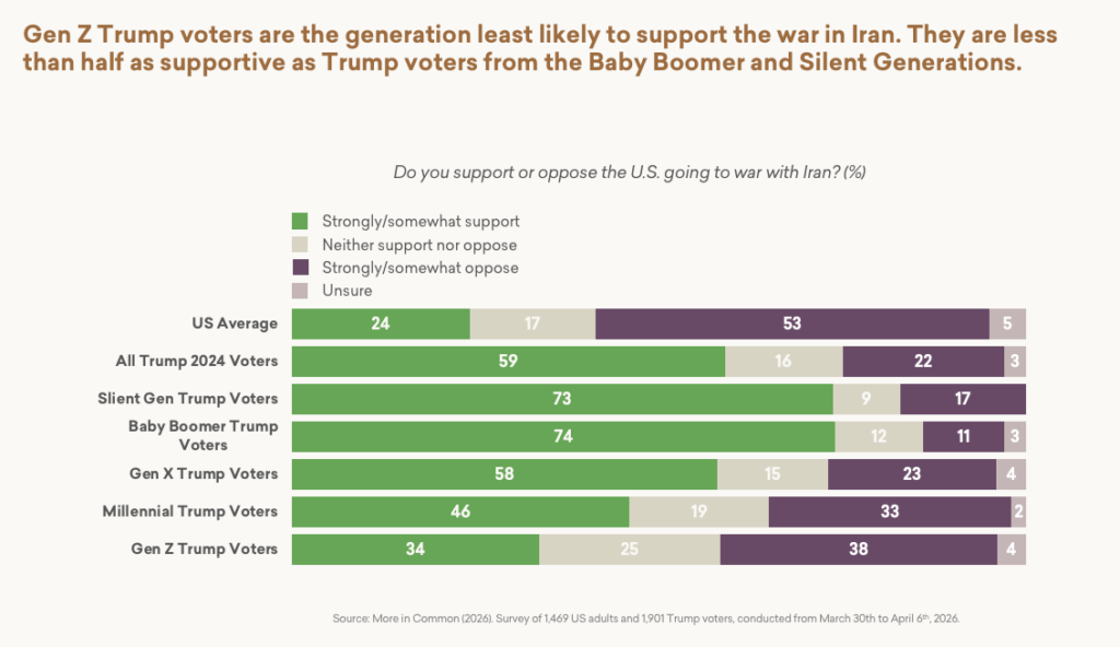 Recent headlines have focused on critics within the conservative media landscape, pointing to elite voices like Tucker Carlson and Megyn Kelly who have publicly broken with the president over the war. Yet this opposition risks being overstated: six in ten of the president’s voters are supportive of the war, his overall approval rating has dipped only modestly, and few Trump voters regret voting for him, with the notable exception of the Reluctant Right.